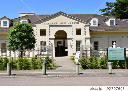 富士河口湖町 山梨宝石博物館入口と青空