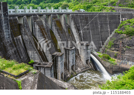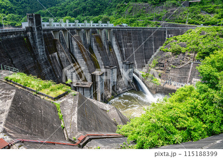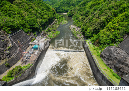 京都府宇治市 梅雨時の調整放水を行っている天ケ瀬ダムと放水口