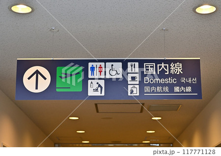 富山空港内の出発ロビー、案内板、自動チェックイン機