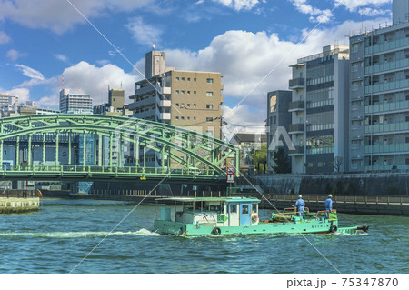 隅田川を進む運搬船、ごみ運搬船、台船、作業船、ポンポン船