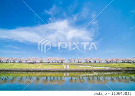 春の青空に映える乙川と桜城橋[愛知県岡崎市]