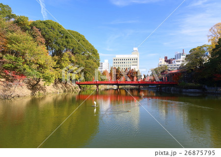 天王寺公園の川底池に掛かる赤い橋(和気橋)
