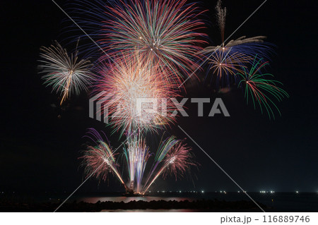 〔福井県南条郡・7月〕河野夏まつり 山々に木霊するダイナミック花火 甲楽城海水浴場正面からの眺め