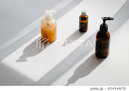 Set of cosmetic glass bottle. Closeup, copyspace. Beauty blogging, salon treatment concept, minimalism brand packaging mock up