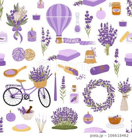 Lavender flowers, herb and bunch seamless pattern. Vector repeated background with wildflowers, air hot balloon, bicycle and floral wreath. Aroma candle and oil, honey jar, spoon with dry herbs or tea