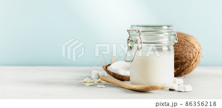 Coconut oil in jar with fresh coconut, Spa cosmetic and food ingredient, banner, copy space
