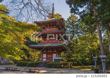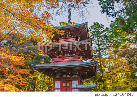 袋井市にある朝の紅葉に包まれた油山寺の三重塔の風景(静岡県)