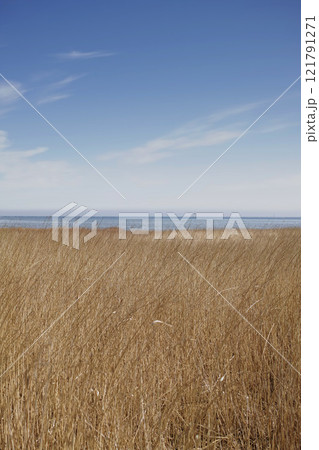 Landscape of reeds at a lake against blue sky background with copyspace by the sea. Calm marshland with wild dry grass in Kattegat, Jutland, Denmark. Peaceful and secluded fishing location in nature