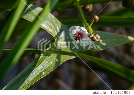 Common arrowhead plant blooming near water in wetland habitat during daylight