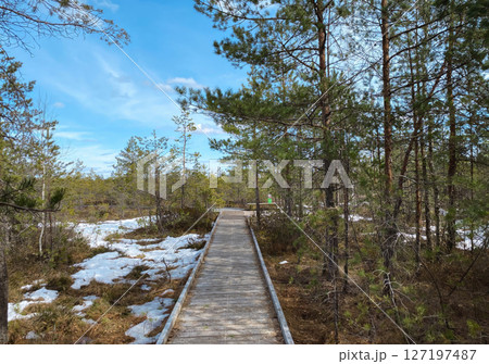 A wooden boardwalk trail winds through a scenic bog landscape in early spring