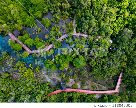 Top view Mangrove forest and river landscape at Thapom Klong Song Nam, Krabi Thailand, Beautiful root in mangrove forest with crystal clear water in small canal,High angle view