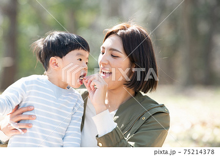 コロナ禍での子育てイメージ・公園でピクニックをする親子・日本人家族イメージ