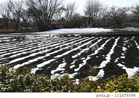 野菜収穫後の畑の畝に沿ってできた残雪のパターン