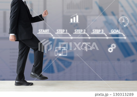ステップに沿ってスタートからゴールを目指すビジネスマンのイメージ画像