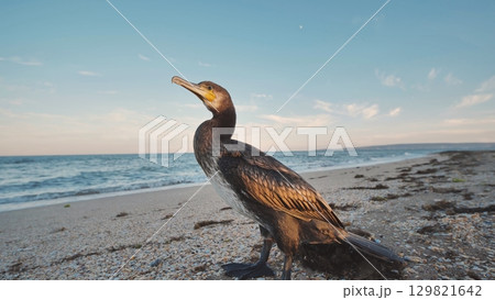 Great cormorant standing on the beach in Crimea at sunset