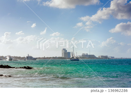 Turquoise waters with sailboat and yachts near coastal city