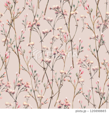 Twig with pink cream buds. Gypsophila flowers watercolor seamless pattern. Dried herbs, dry blades of grass for fabric, wallpaper print isolated rose pastel coloured background hand drawn illustration