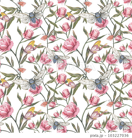 Seamless pattern butterfly, cicada, peony isolated on white background. Watercolor hand drawn illustration. Art design