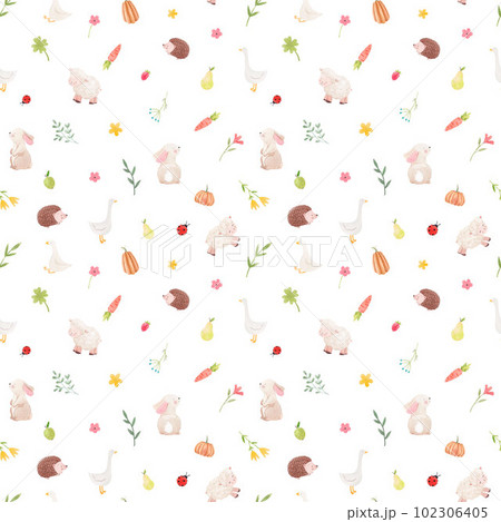 Beautiful children's seamless pattern with hand drawn watercolor cute animals flowers and veggies. Stock illustration.