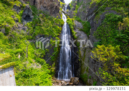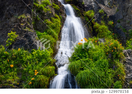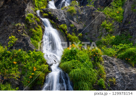 新潟県佐渡市岩谷口 外海府海岸沿い佐渡一周線からのヤマユリやトビシマカンゾウが咲く五段の滝の景色