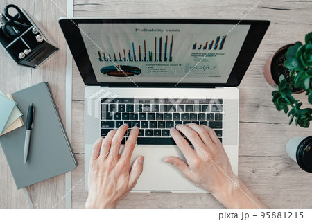 top view. man using a laptop to analyze financial data.