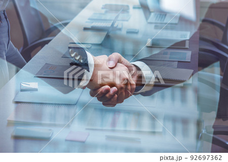 Close-up hands of unrecognizable business people handshaking after negotiation for business deal and acquisition in office sitting at desk. Closeup of businessmen sign contract agreement on paper.