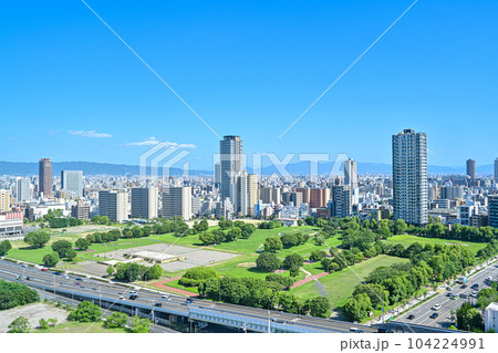 難波離宮公園、法円坂遺跡と大阪城の風景