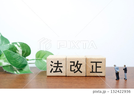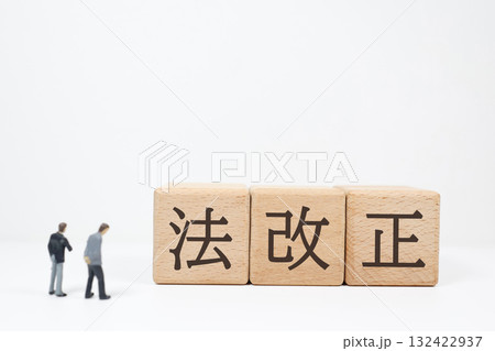 法改正を象徴する木のブロックとビジネスマンのミニチュア。