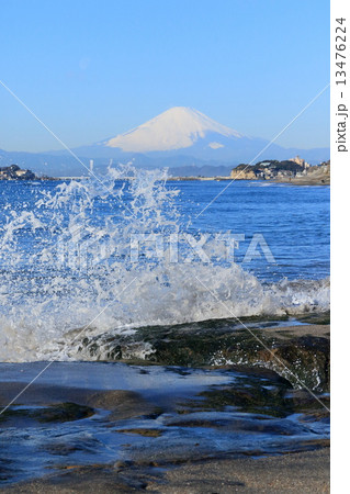 (静岡県)西伊豆の海岸から望む、波濤と富士山