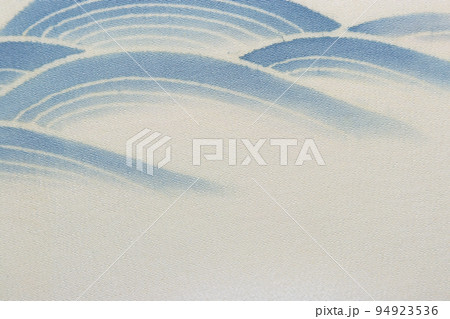 アンティークな日本の絹織り着物生地、薄青の筆書きした波模様入りのテクスチャー。