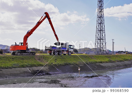 川床に堆積した泥を掘り上げる重機 洪水対策の土木工事風景