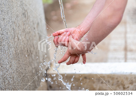水道の水で手を洗う