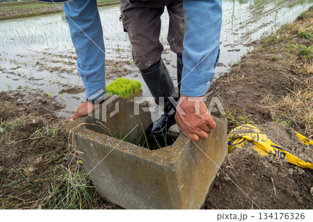 田植えで汚れた長靴の汚れを水口で洗い流す