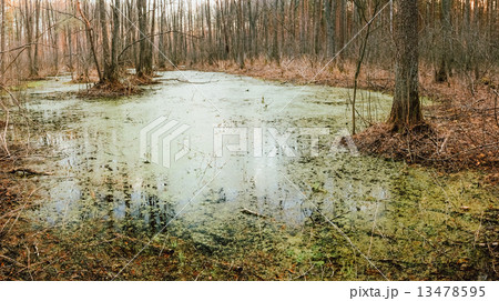 Swamp with trees in the forest. The concept of ecology and environmental protection.
