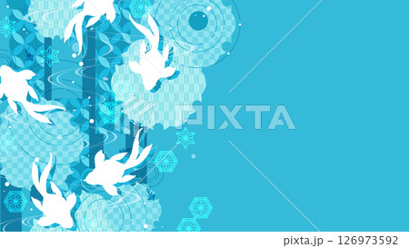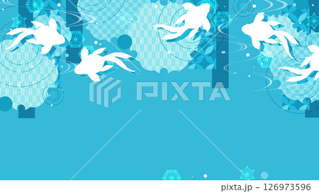紅葉の木下、水の中を黒と赤の金魚とメダカが優雅に泳ぐ水の波紋が美しいデザインのベクター夏フレーム素材