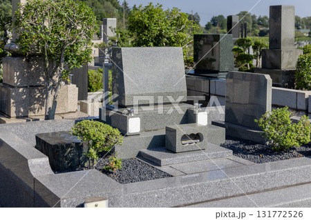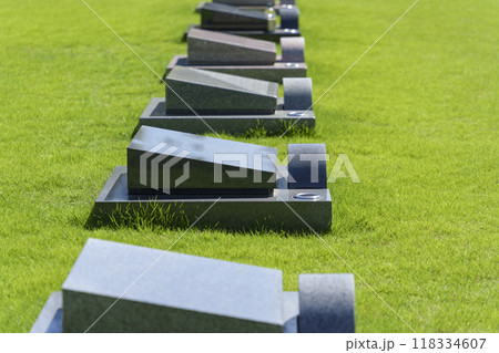 芝生墓地の洋風墓石。晴れた日の墓地の風景イメージ。
