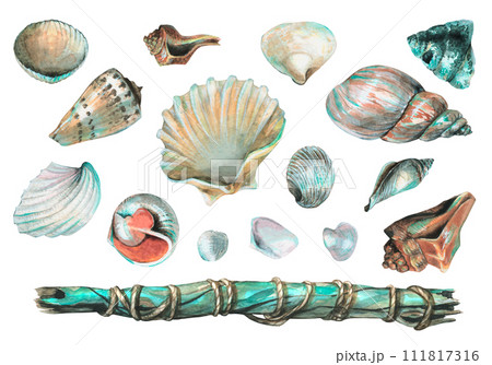 watercolor illustration of various seashells and wooden stick. A lot of shells for interior decoration, the beach. For the decoration and design of postcards, posters, clothing, home decor