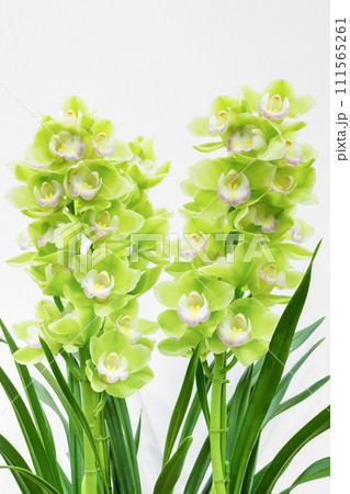 黄緑色のシンビジウムの花 洋蘭 白背景