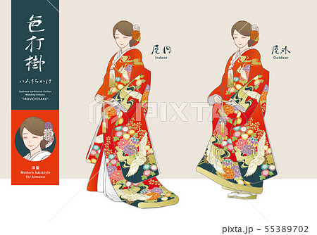 色打掛姿の女性のベクターイラストセット(洋髪)(赤ベースの着物)