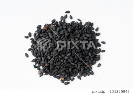 白背景にスプーンに載せた黒ごま(生ごま)のクローズアップ
