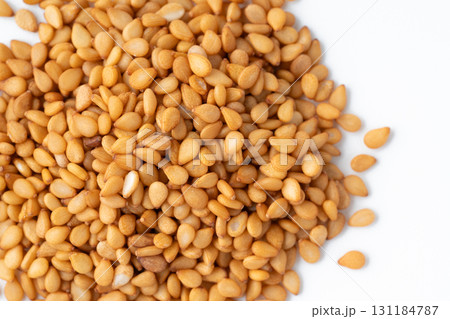 白背景にスプーンに載せた金ごま(生ごま)のクローズアップ