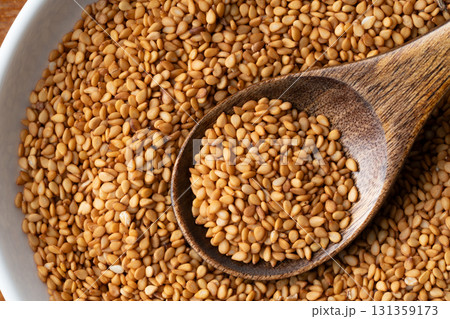 スプーンに載せた金ごま(生ごま)のクローズアップ