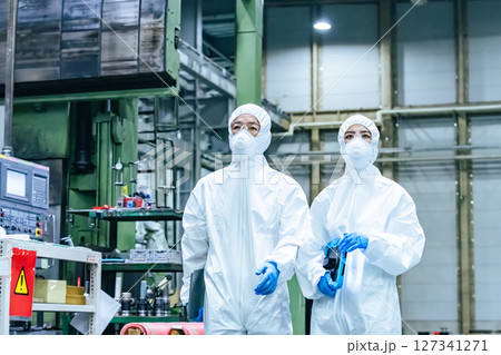 防護服を着て工場を歩く男女作業員