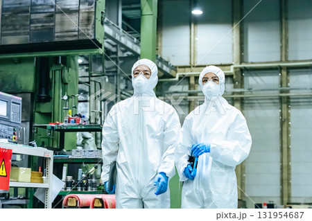 工場を歩く防護服を着た男女作業員