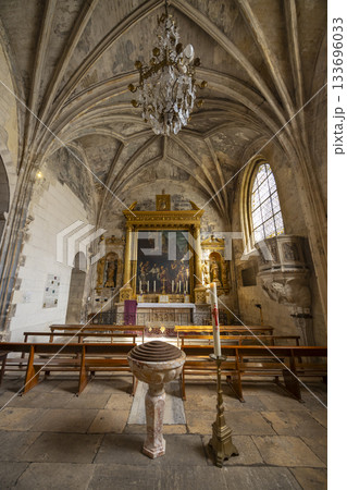 Arles church interior with vaulted ceiling and altar