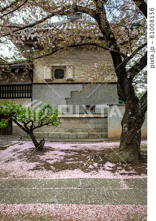 妙顕寺の春、土蔵の建つ参道の地面に桜の花びらが降り積もる