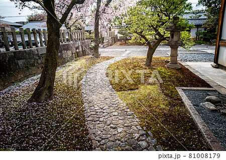 妙顕寺の春、満開の桜が散る方丈前の壺庭と苔むした石畳の小道