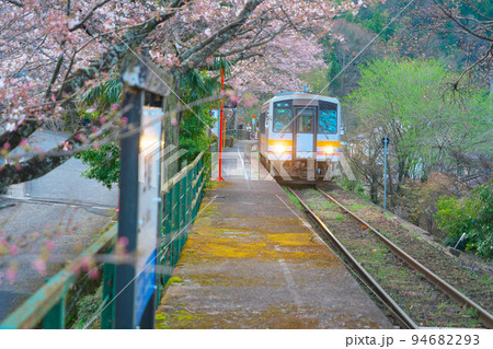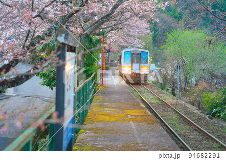 ソメイヨシノ咲く因美線三浦駅を発車する津山行き普通列車 岡山県津山市