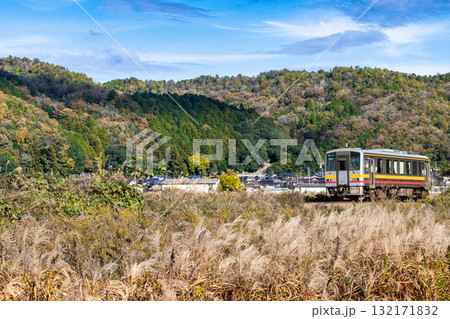 晩秋の姫新線 ススキの穂がなびく向こうを走る津山駅行き普通列車4 兵庫県佐用郡佐用町