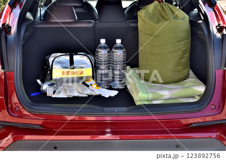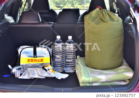 自動車の荷室に積み込んだ非常持ち出し袋